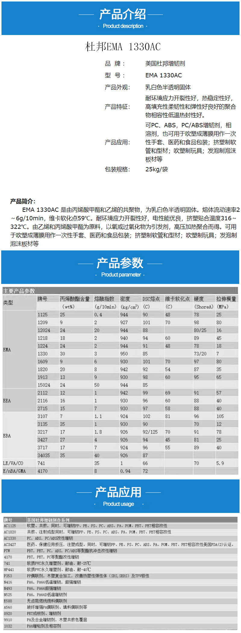 - EMA 杜邦 1330AC 相溶剂 增韧剂 注塑级 乙烯丙烯酸甲酯 美国 物性表, EMA 杜邦 1330AC 相溶剂 增韧剂 注塑级 乙烯丙烯酸甲酯 美国 产品参数,EMA 杜邦 1330AC 相溶剂 增韧剂 注塑级 乙烯丙烯酸甲酯 美国 性能表,EMA 杜邦 1330AC 相溶剂 增韧剂 注塑级 乙烯丙烯酸甲酯 美国 出厂报告, MSDS,, 物质安全资料表, UL黄卡,{ SGS报告, RoHS, 食品级认证, NSF饮用水标准, 产品资料, 产品性能, 出厂报告, 原厂原包, 代理商, 热变形温度, 熔指数, 流动系数, 抗冲击性能、冲击强度, 低温韧性、低温抗冲击性能, 熔体流动系数、熔体流动速率, 加工工艺、加工参数、加工温度, 欧盟RoHS 德国FDA 美国FDA 日本FDA