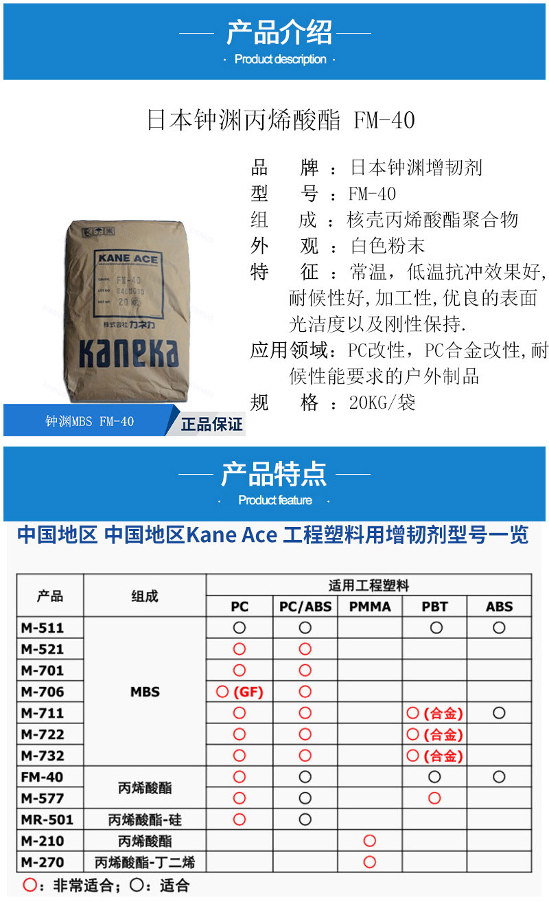 Kane Ace FM-40是一种全丙烯酸酯类核壳型抗冲击改性剂。