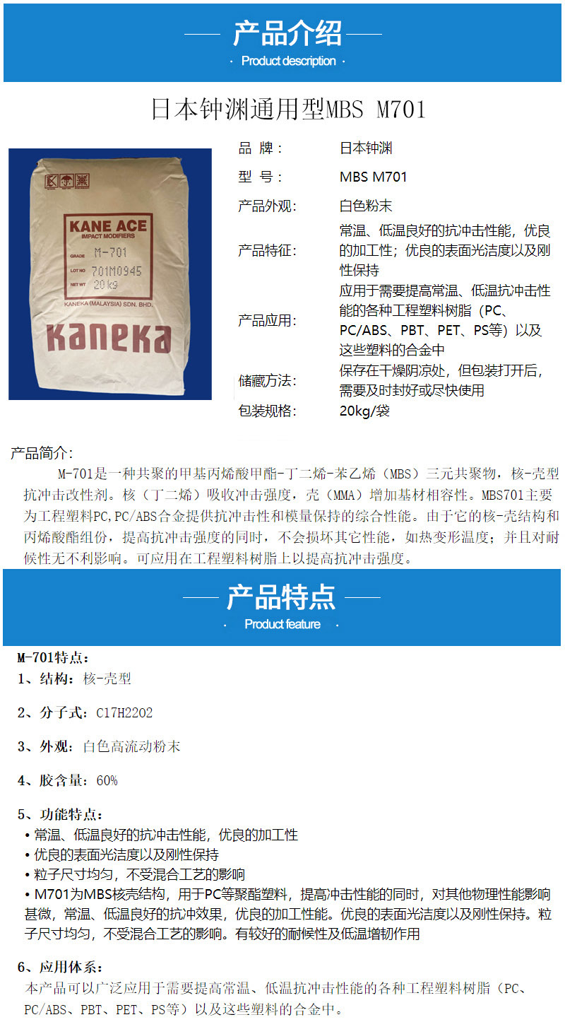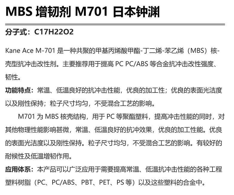 - 日本钟渊MBS M701增韧剂 PC/ABS合金抗冲击剂 增韧改性钟渊mbs701 物性表, 日本钟渊MBS M701增韧剂 PC/ABS合金抗冲击剂 增韧改性钟渊mbs701 产品参数,日本钟渊MBS M701增韧剂 PC/ABS合金抗冲击剂 增韧改性钟渊mbs701 性能表,日本钟渊MBS M701增韧剂 PC/ABS合金抗冲击剂 增韧改性钟渊mbs701 出厂报告, MSDS,, 物质安全资料表, UL黄卡,{ SGS报告, RoHS, 食品级认证, NSF饮用水标准, 产品资料, 产品性能, 出厂报告, 原厂原包, 代理商, 热变形温度, 熔指数, 流动系数, 抗冲击性能、冲击强度, 低温韧性、低温抗冲击性能, 熔体流动系数、熔体流动速率, 加工工艺、加工参数、加工温度, 欧盟RoHS 德国FDA 美国FDA 日本FDA